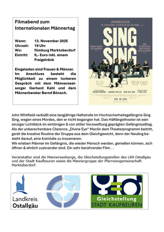 Eingeladen sind Frauen und Männer. Anschließend Möglichkeit über den Film in ein lockeres Gespräch zu kommen. Die Moderation haben der Männerseelsorger Gerhard Kahl und der Männerberater Bernd Bönsch. Veranstalter sind die Männerseelsorge, die Gleichstellungsstellen des LRA Ostallgäu und der Stadt Kaufbeuren sowie die Männergruppe der Pfarreiengemeinschaft Marktoberdorf.