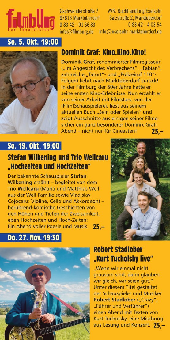 „Buchmusikfilm“ heißt die Veranstaltungsreihe, die Andrea Albrecht, Claus Strunz und Monika Schubert zusammen ins Leben gerufen haben. Wobei: Ganz neu ist das Konzept nicht. „Lesungen haben eine lange Tradition in Marktoberdorf“, sagt Monika Schubert. Und genau daran will das Trio anknüpfen - mit neuen Ideen, wichtigen Themen und prominenten Namen. Unter anderem kommt der Schauspieler Robert Stadlober in die Filmburg nach Marktoberdorf. Den Zuschauerinnen und Zuschauern dürfte er aus zahlreichen Film- und Fernsehproduktionen bekannt sein - wie etwas aus der Serie „Kafka“ (2024), in der Stadlober den Schriftsteller Felix Weltsch verkörperte. Und damit wären wir bereits mittendrin in der großen Literatur.